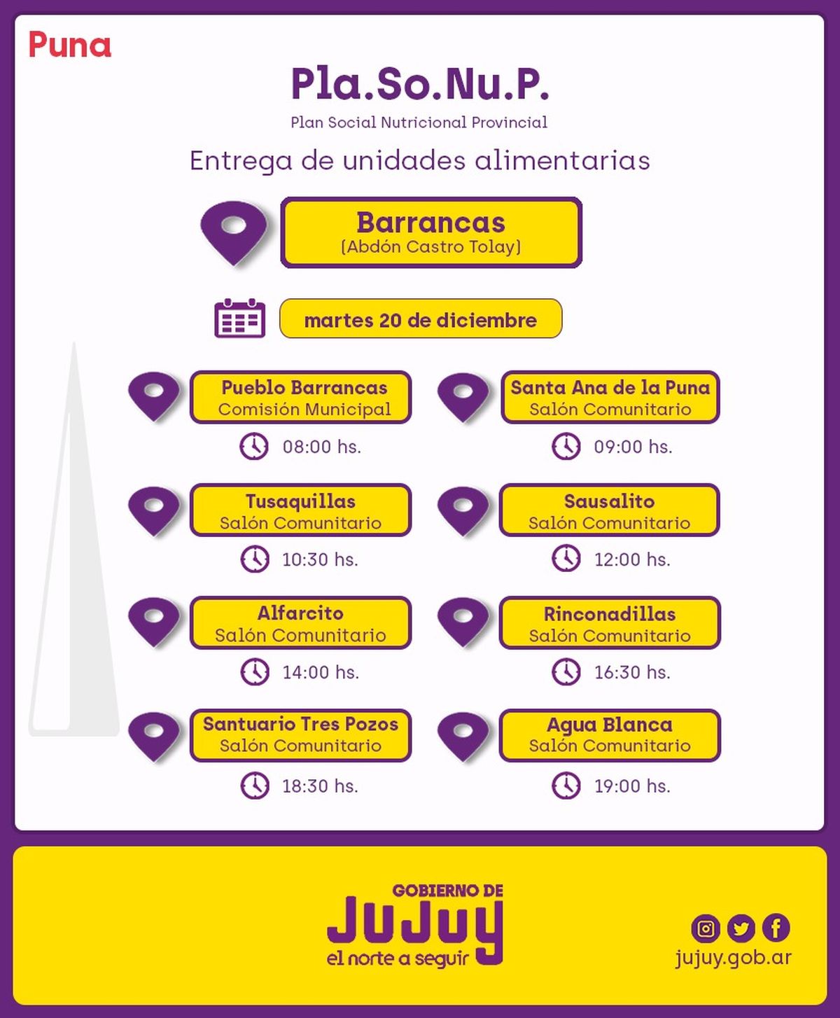 El martes 20 de diciembre, la entrega de módulos alimentarios comenzará en el Pueblo Barrancas, a las 08:00 horas; continuará en las comunidades Santa Ana de la Puna, en el Salón Comunitario, a las 09:00 horas; luego en Tusaquillas, en el Salón Comunitario, a las 10:30 horas; en Sausalito tendrá lugar en el Salón Comunitario, a las 12:00 horas.