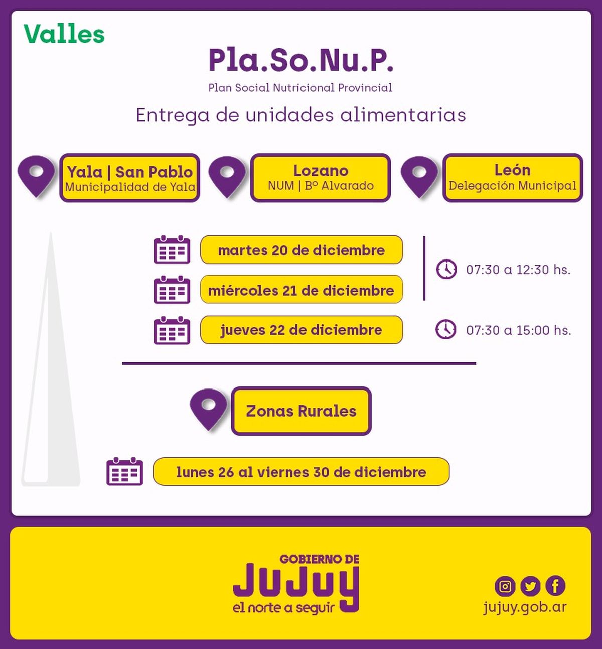 Por la tarde, la entrega continuará en San Francisco de Alfarcito, en el Salón Comunitario, a las 14:00 horas; luego en Rinconadillas, en el Salón Comunitario, a las 16:30 horas; en Santuario de Tres Pozos, en el Salón Comunitario, a las 18:30 horas y finalizará en Agua Blanca, en el Salón Comunitario, a las 19:00 horas.