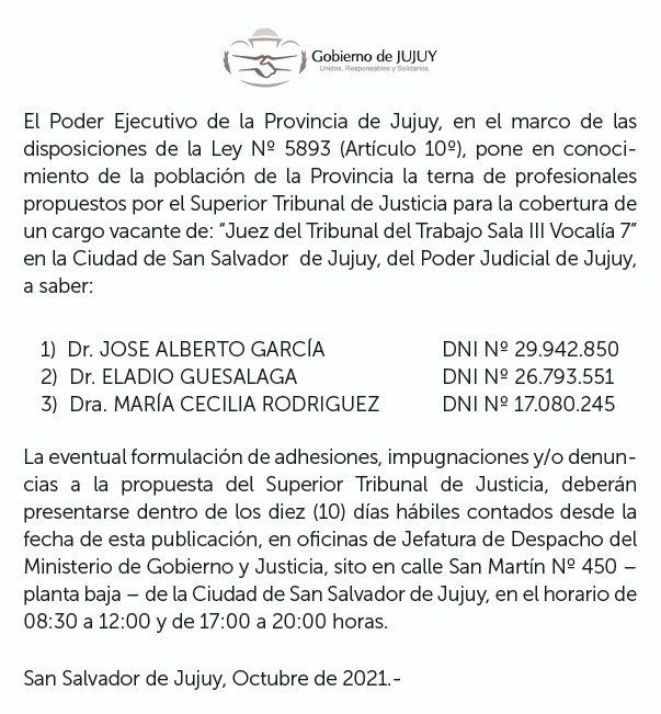 La terna de profesionales propuesto por el Superior Tribunal de Justicia para la cobertura de un cargo vacante de: Juez del Tribunal de Justicia del Trabajo Salla III Vocalía 7 en la ciudad de San Salvador de Jujuy, presenta el siguiente listado de profesionales;