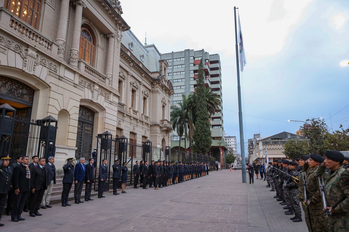 En la explanada de Casa de Gobierno, el titular del Poder Ejecutivo, Carlos Sadir, encabezó el acto de izamiento de la Bandera Nacional y la Bandera de la Libertad Civil, dando inicio de esta manera a la Semana de la Policía de Jujuy.