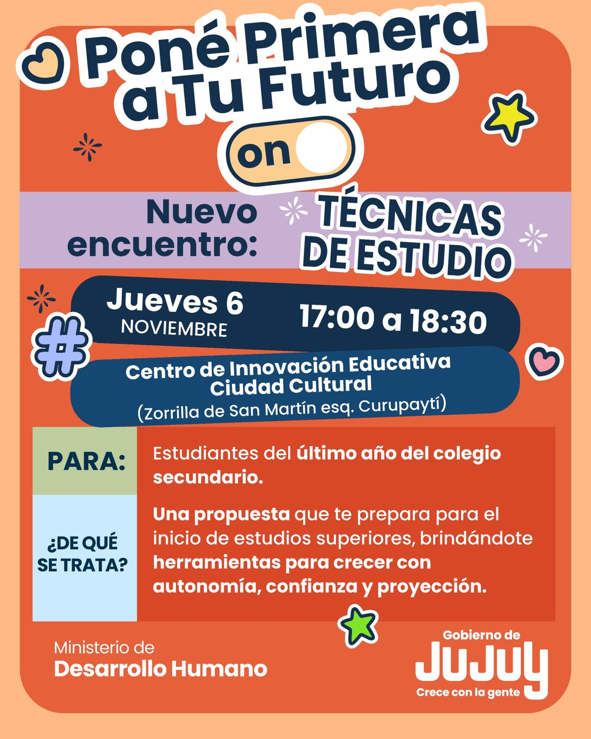 El Ministerio de Desarrollo Humano de Jujuy, a través de la Secretaría de Desarrollo Integral y la Coordinación de Calidad de Vida, llevará adelante el cuarto encuentro del programa “Poné Primera a Tu Futuro” que en esta oportunidad abordará la temática “Técnicas de Estudio”.