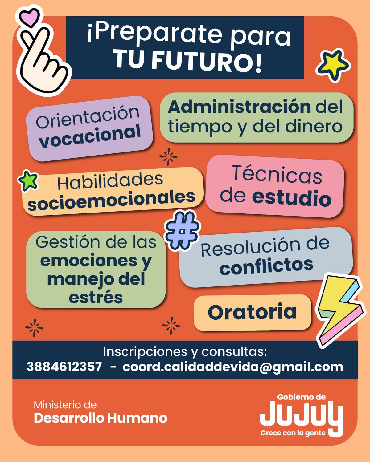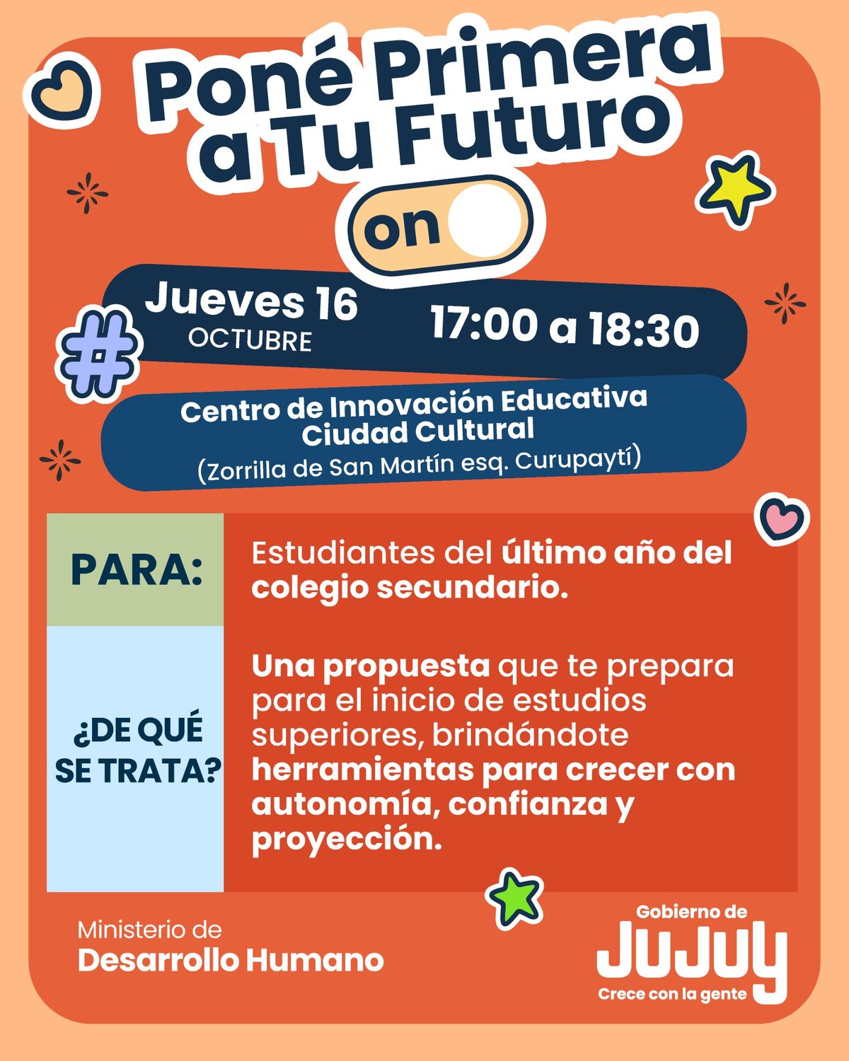 El Ministerio de Desarrollo Humano de Jujuy, a través de la Secretaría de Desarrollo Integral y la Coordinación de Calidad de Vida, invita a estudiantes del último año del nivel secundario a participar del programa “Poné Primera a Tu Futuro”, una propuesta para la superación personal de los estudiantes en el cierre de su etapa escolar e inicio de una nueva etapa de vida con herramientas de crecimiento personal, autonomía y proyección.