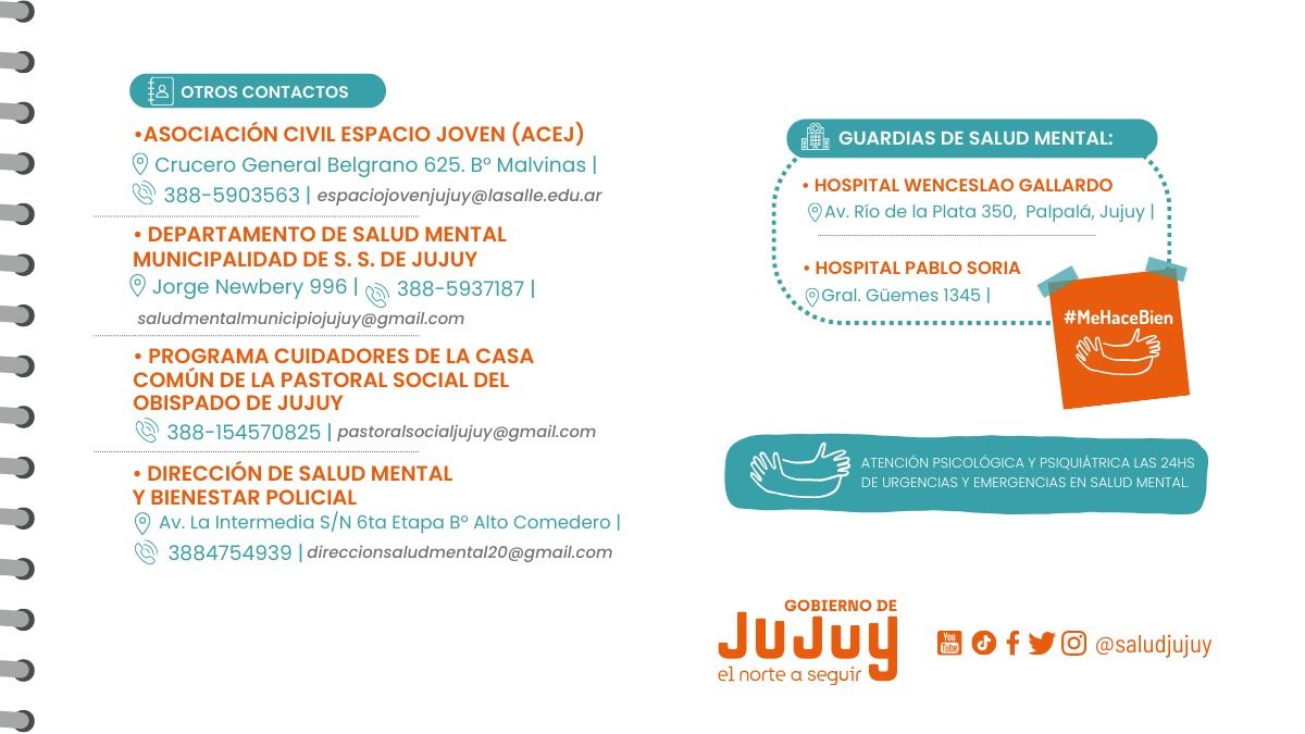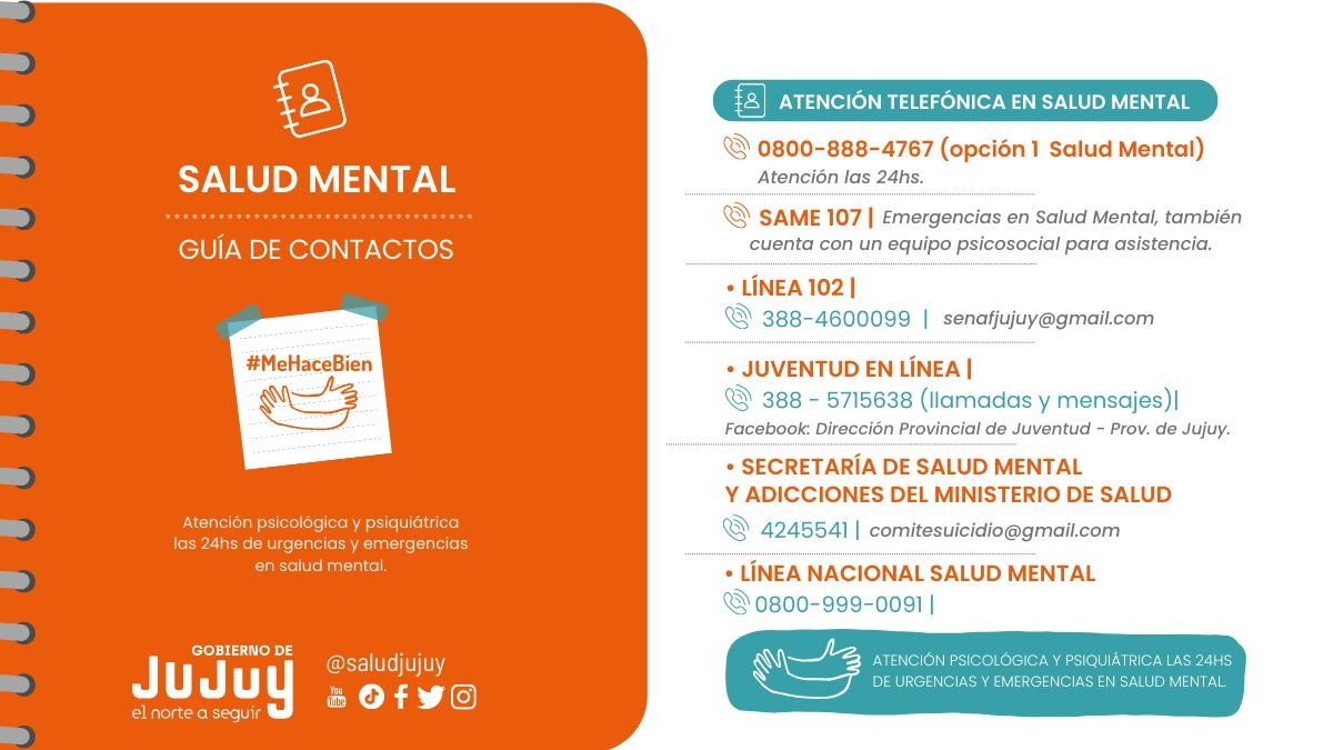El Ministerio de Salud de Jujuy informó a la comunidad que en el marco de la Campaña #MeHaceBien en el mes de la prevención del suicidio se realizará la presentación oficial de la “Guía práctica para cuidarme y cuidar a mi comunidad en el abordaje comunicacional del suicidio y la salud mental”, documento desarrollado íntegramente en la provincia que apunta a favorecer prácticas positivas en la red de medios de comunicación desde el trabajo periodístico tanto en la labor hacia la comunidad como en el propio ejercicio de las y los trabajadores periodistas.
