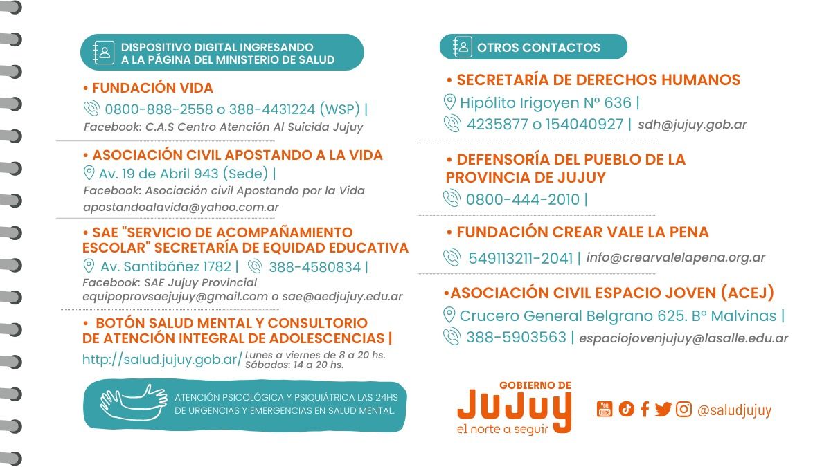 El jueves 22 de septiembre desde horas 15.30 en el Camping Municipal de La Quiaca, Ruta N° 5 S/N, tendrá lugar la capacitación denominada “Abordaje de la problemática del suicidio en los medios: claves para una comunicación responsable” para la cual se solicita a trabajadores de los medios de comunicación registrar inscripción en https://acortar.link/MNPwaT