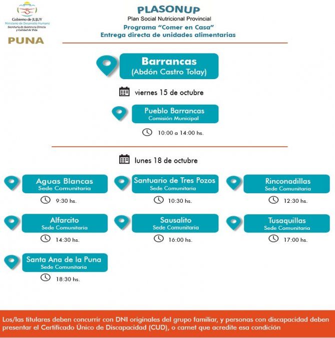 -Lunes 18 de octubre, comenzará en Aguas Blancas en la Sede Comunitaria, a las 9:30 horas; en Santuario de los Pozos en la Sede Comunitaria, a las 10:30 horas; en Rinconadillas en la Sede Comunitaria, a las 12:30 horas. Continuará en San Francisco de Alfarcito, a las 14:30 horas; en Sausalito en la Sede Comunitaria, a las 16:00 horas; en Tusaquillas en la Sede Comunitaria a las 17:00 y finalizará en Santa Ana de la Puna en la Sede Comunitaria, a las 18:30 horas.