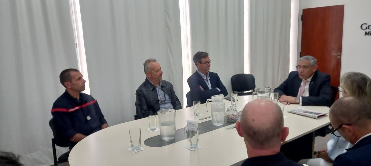 El ministro de seguridad, Guillermo Corro, junto al Secretario de Integración Regional y Relaciones Internacionales, Pablo Palomares, se reunieron con la comitiva francesa encabezada por Sybil Pecriaux y bomberos del Departamento de La Vienne.