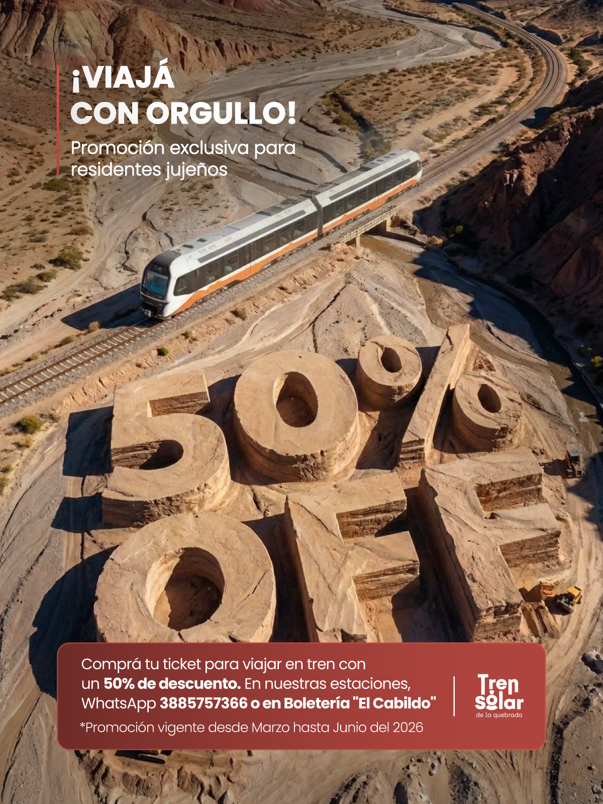 El Tren Solar de la Quebrada continúa fortaleciendo su vínculo con la comunidad local con la promoción “Orgullo Jujeño”, una iniciativa pensada para que más jujeños puedan vivir y redescubrir su territorio de una manera única. En este marco, la promo se aplica a ambas experiencias del recorrido —360° y 180°— se encuentran disponibles para residentes, con tarifas promocionales especiales.