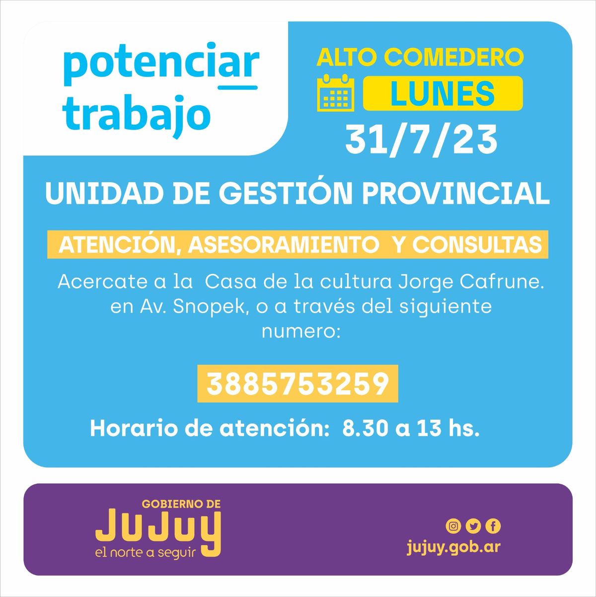 El Ministerio de Desarrollo Humano a través de la Unidad de Gestión Provincial Jujuy brindará el próximo lunes 31 de julio, asesoramiento y consultas sobre temas de interés a titulares activos del programa Potenciar Trabajo.