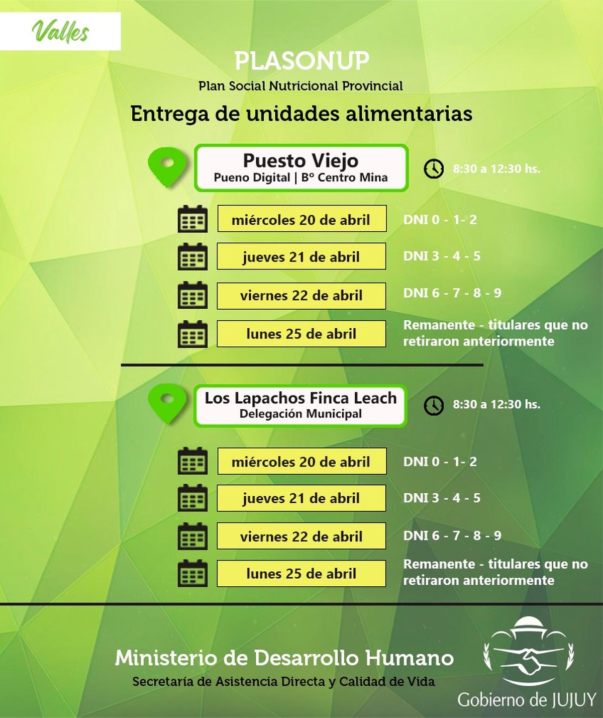 -En Puesto Viejo, se efectuará los días miércoles 20, jueves 21, viernes 22 y lunes 25 de abril, por terminación de DNI, de la siguiente manera: