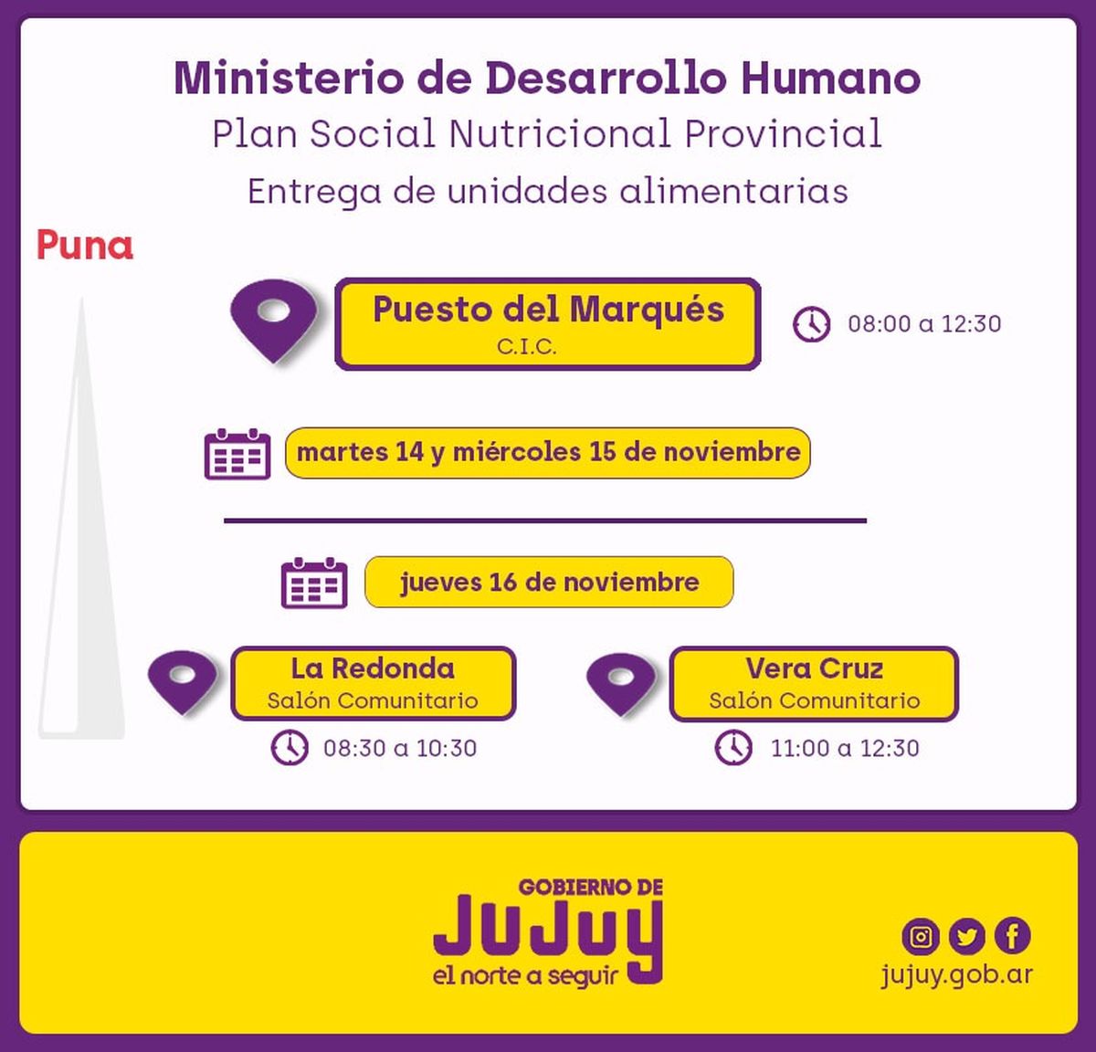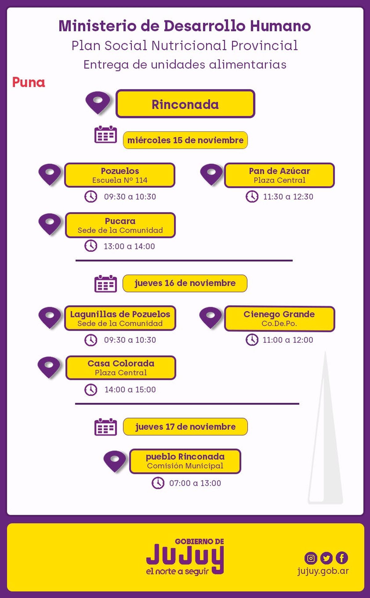Miércoles 15 de noviembre, el operativo comenzará en Pozuelos, en la Escuela Primaria Nº 114, en el horario de 09:30 a 10:30 y en Pan de Azúcar, en la Plaza Central, en el horario de 11:30 a 12:30 y finalizará en Pucara, en la Sede de la Comunidad, en el horario de 13:00 a 14:00