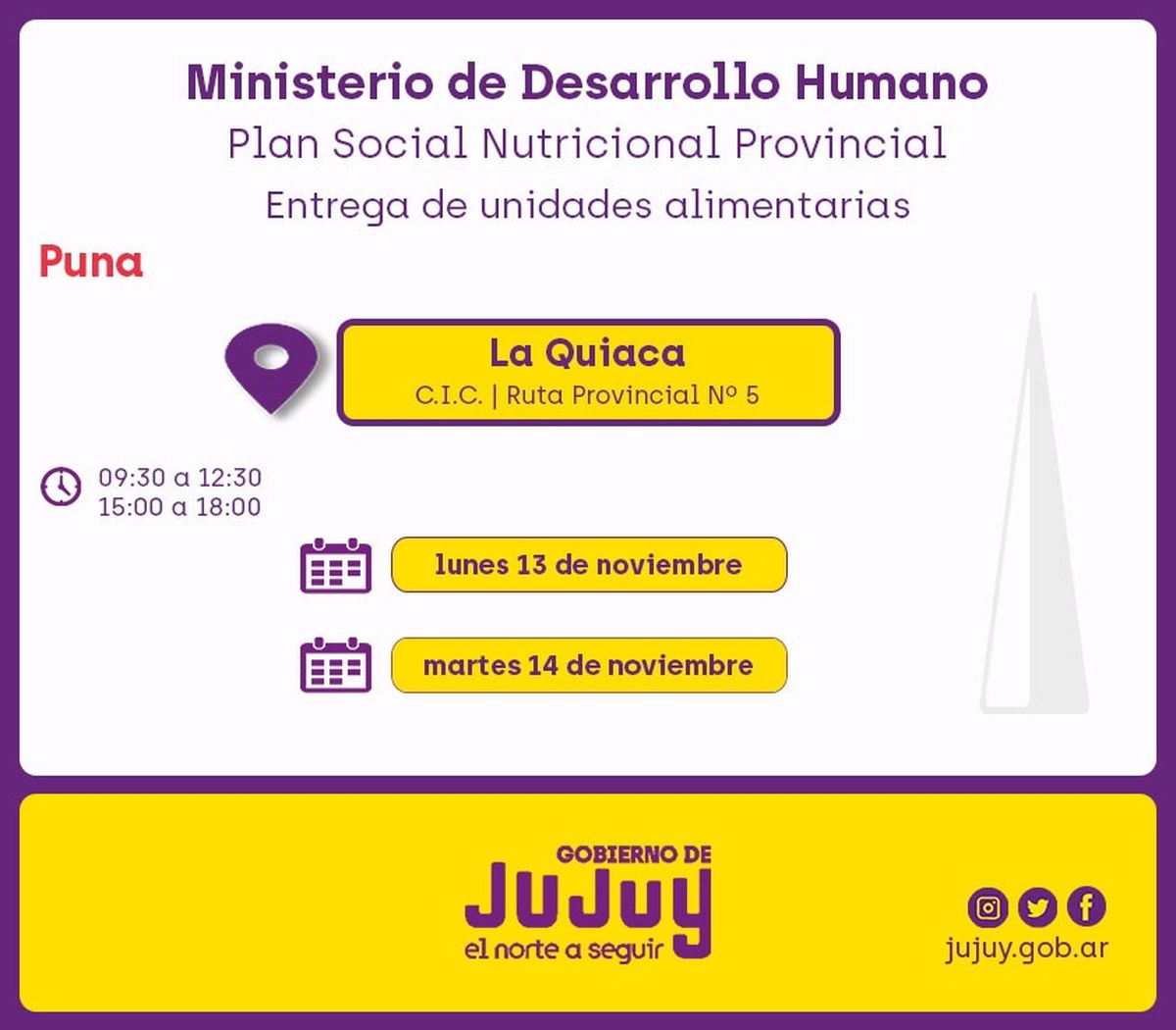 En La Quiaca, se concretará los días lunes 13 y martes 14 de noviembre, en el Centro Integrador Comunitario, ubicado en Ruta Provincial Nº 5, en los horarios de 09:30 a 12:30 y 15:00 a 18:00.