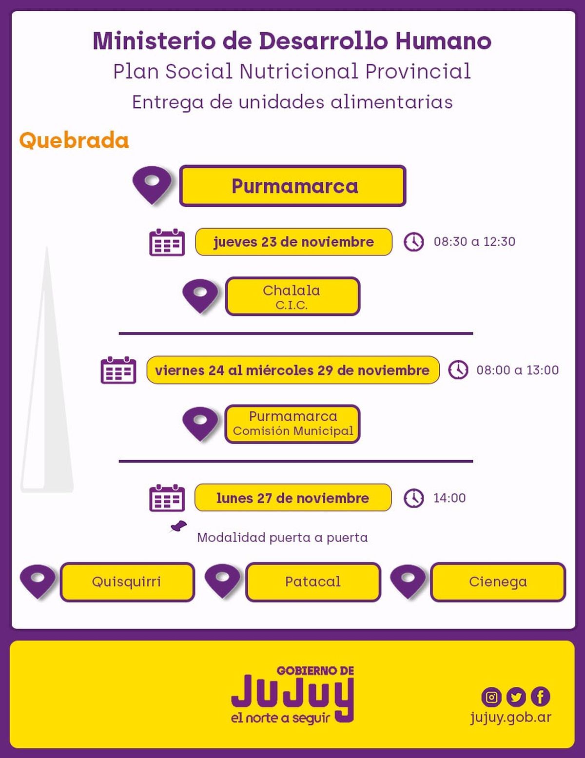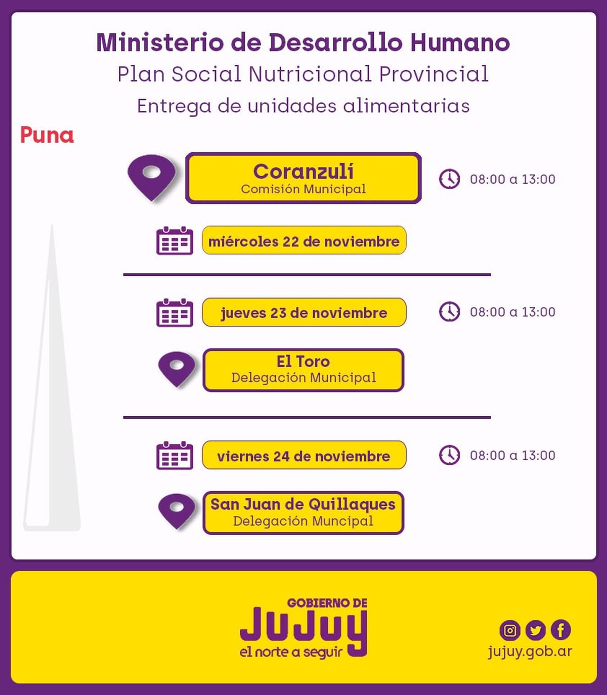 El Ministerio de Desarrollo Humano, a través de la Secretaría de Asistencia Directa y Calidad de Vida, comunica que desde el miércoles 22 de noviembre, se efectuará la entrega directa de unidades alimentarias del Programa “Comer en Casa”, a familias de las regiones de Quebrada y Puna.