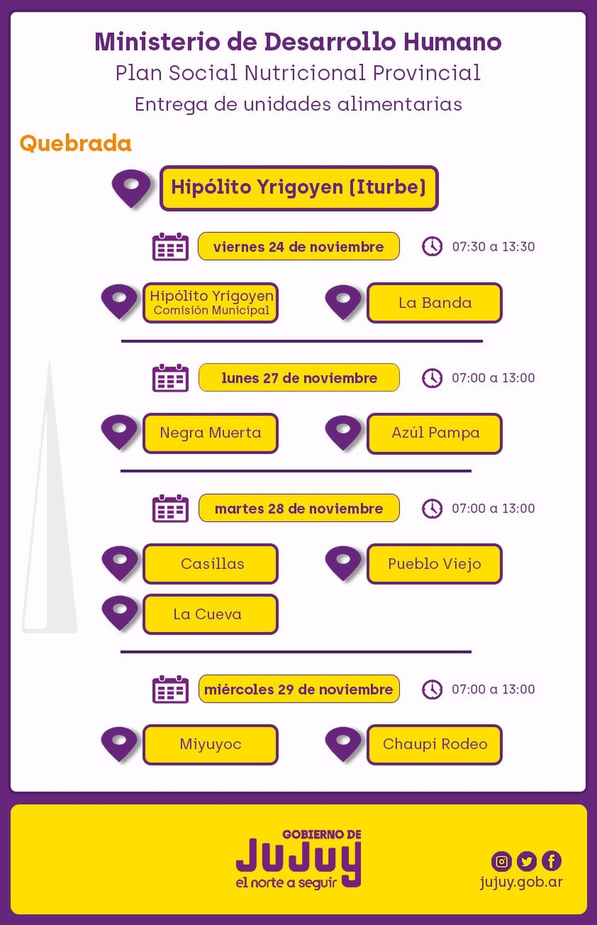 En tanto que en Hipólito Irigoyen (Iturbe), se concretará desde el viernes 24 al miércoles 29 de noviembre, de la siguiente forma: