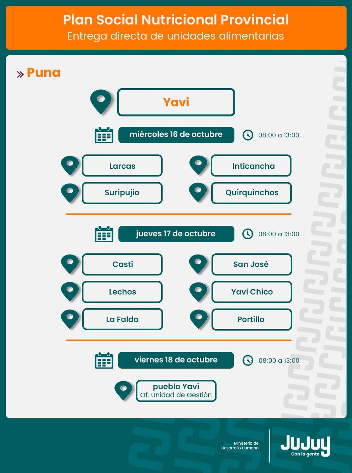 Jueves 17 de octubre, continuará en las comunidades Casti, San José, Lechos, Yavi Chico, paraje La Falda, Portillo, en el horario de 08:00 a 13:00.