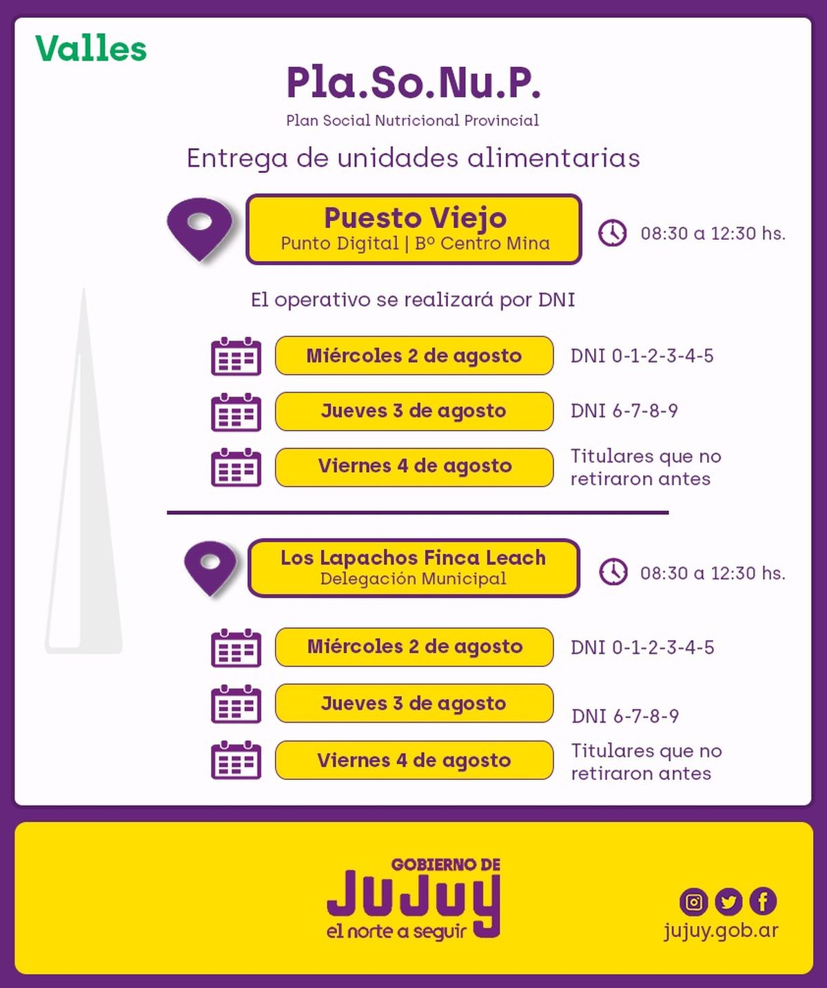 En Los Lapachos Finca Leach, se realizará en la Delegación Municipal, según la terminación de DNI, en el horario de 08:30 a 12:30, de la siguiente forma:
