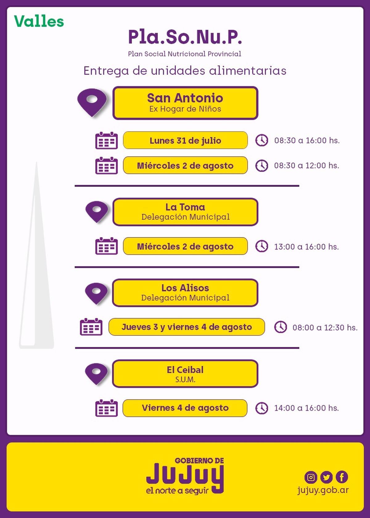 El Ministerio de Desarrollo Humano, a través de la Secretaría de Asistencia y Calidad de Vida, comunica que desde el lunes 31 de julio, se realizará la entrega directa de unidades alimentarias del Programa “Comer en Casa”, a familias de San Antonio y Puesto Viejo.