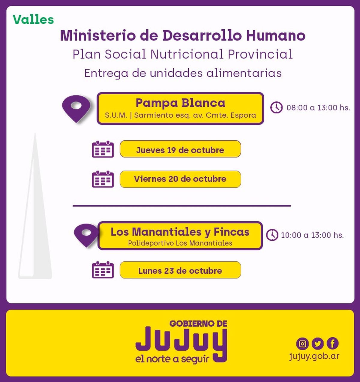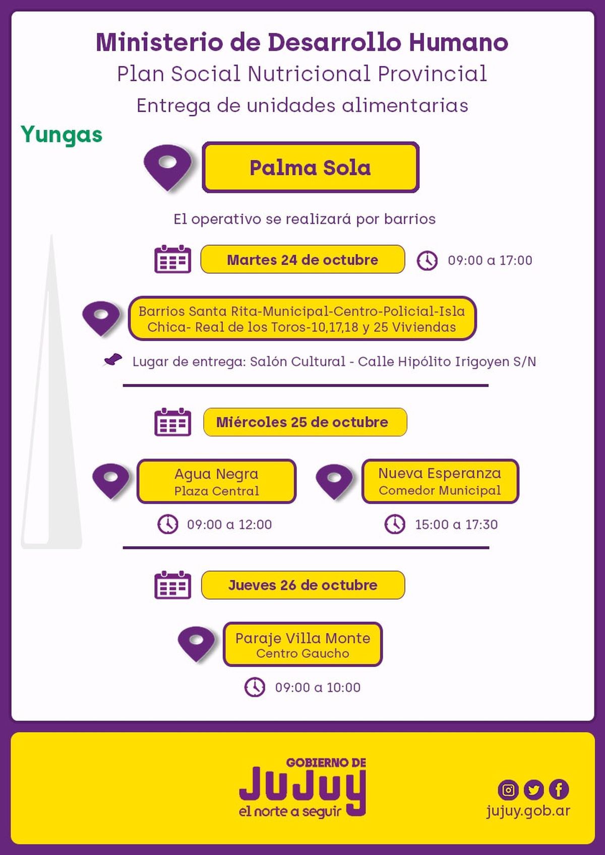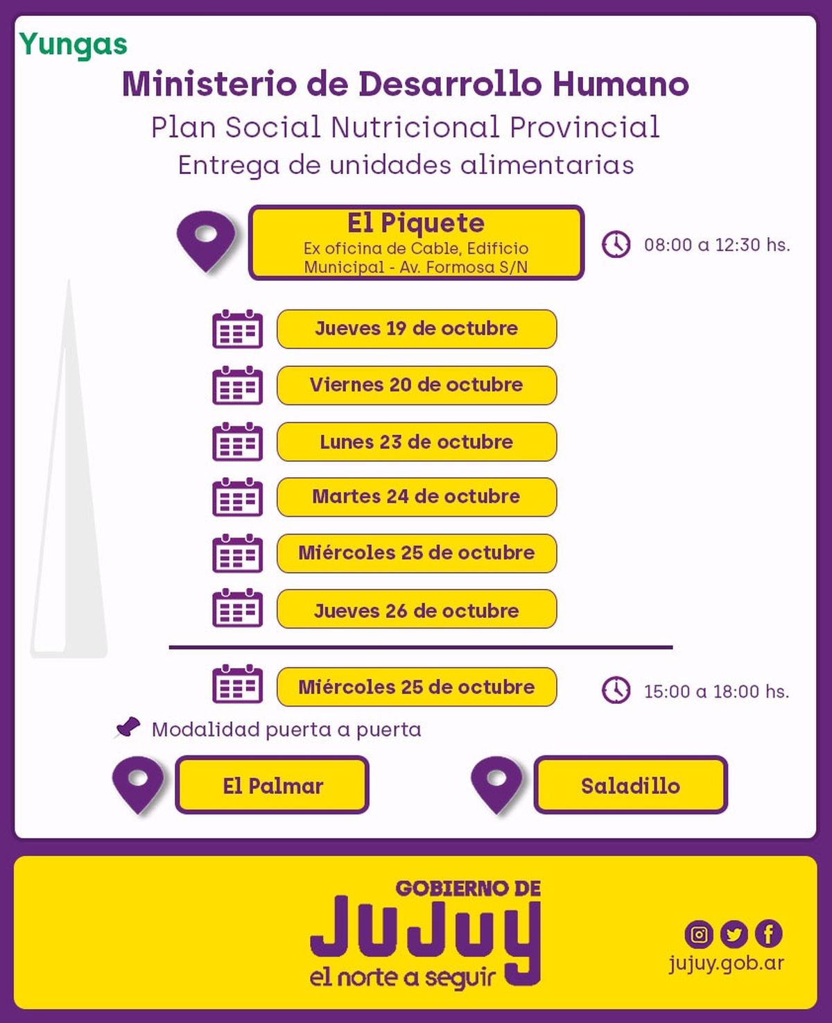 El Ministerio de Desarrollo Humano, a través de la Secretaría de Asistencia Directa y Calidad de Vida, informa que desde el jueves 19 de octubre, se concretará la entrega de unidades alimentarias del Programa “Comer en Casa”, a familias de localidades de estas dos regiones.