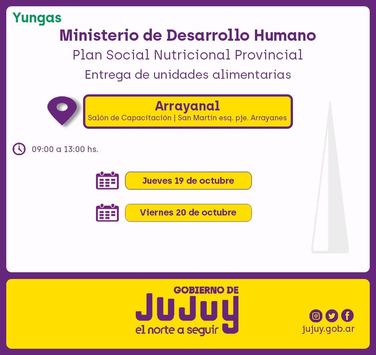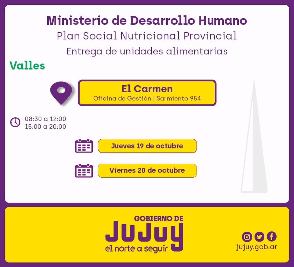 -En San Pedro de Jujuy, se llevará a cabo desde el viernes 20 al lunes 23 de octubre, en el Centro Integrador Comunitario, ubicado en avenida San Expedito y Raúl Alfonsín s/n, barrio Nueva Ciudad, según la terminación de DNI, en el horario de 08:00 a 18:00, de la siguiente forma: