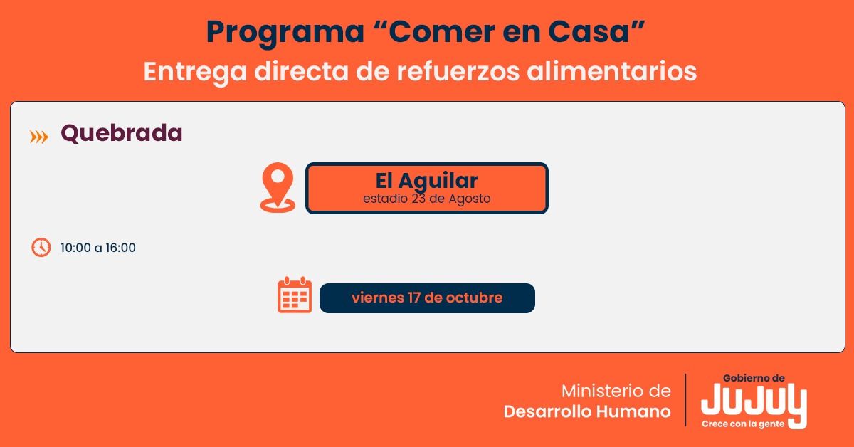 El Ministerio de Desarrollo Humano de Jujuy, a través de la Secretaría de Asistencia Directa, comunica que desde el viernes 17 de octubre en las localidades de El Aguilar y El Cóndor, se realizará la entrega directa de unidades alimentarias del programa “Comer en Casa”.
