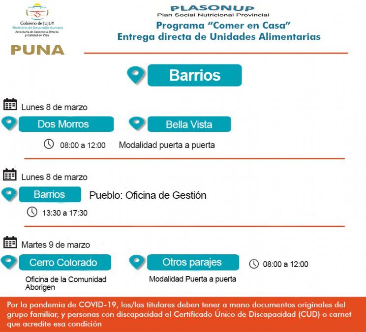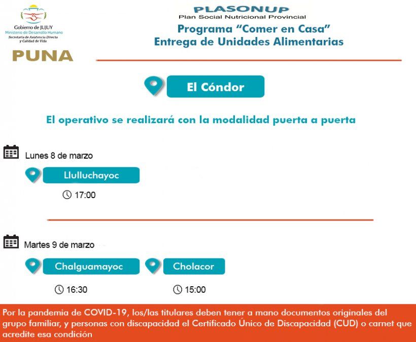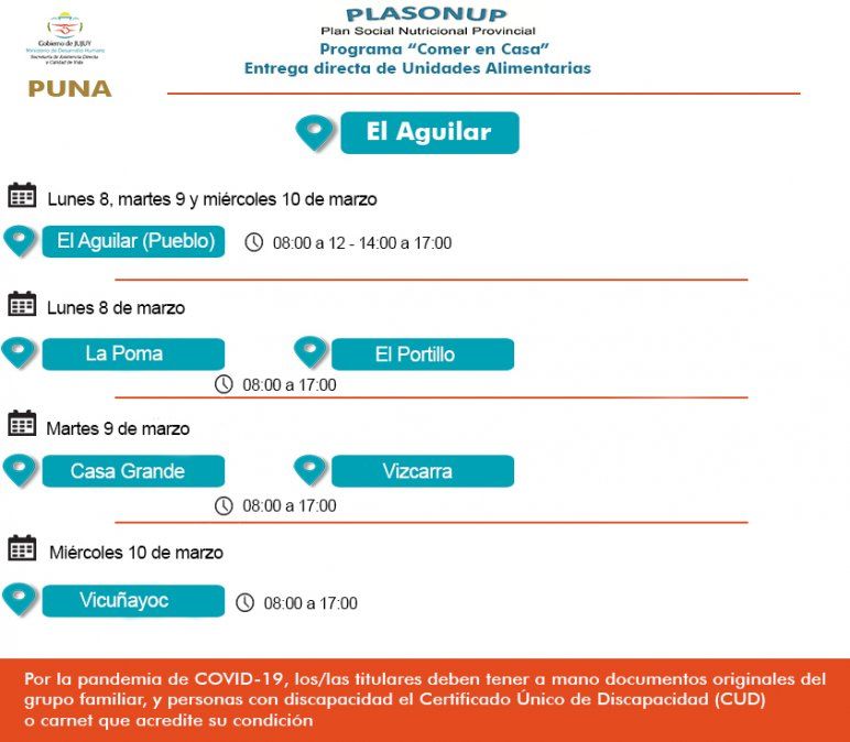 - En El Aguilar, se efectuará los días lunes 8, martes 9 y miércoles 10 de marzo, en el Salón Avelino Bazán, de 8:00 a 12:00 y de 14:00 a 17:00 horas. Mientras que en los parajes se realizará la entrega con la modalidad puerta a puerta: lunes 8 en La Poma y El Portillo; martes 9 en Casa Grande y Vizcarra; y el miércoles 10 en Vicuñayoc.