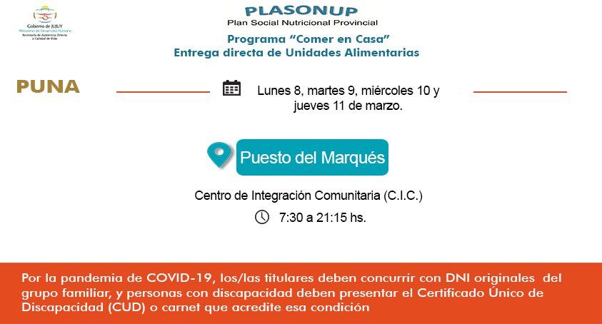 El Ministerio de Desarrollo Humano, a través de la Secretaría de Asistencia Directa y Calidad de Vida, comunicó que desde el lunes 8 de marzo se llevará a cabo la entrega de Unidades Alimentarias del Plan Social Nutricional Provincial (Pla.So.Nu.P.), a titulares de La Quiaca, Barrios, Puesto de Marqués, Pumahuasi, El Cóndor y El Aguilar.