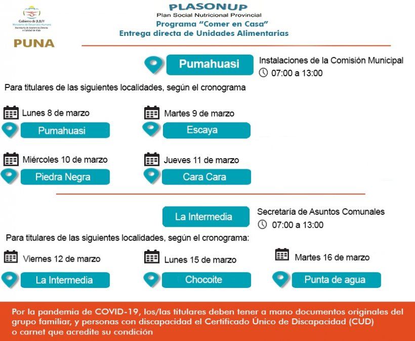 - En Pumahuasi, tendrá lugar en las Instalaciones de la Comisión Municipal de 7:00 a 13:00 horas, a donde tendrán que concurrir el lunes 8 titulares de Pumahuasi, el mates 9 titulares de Escaya, el miércoles 10 titulares de Piedra Negra y el jueves 11 titulares de Cara Cara. En tanto que en La Intermedia se realizará en la Secretaría de Asuntos Comunales en el horario de 7:00 a 13:00, a donde deberán dirigirse el viernes 12 titulares de La Intermedia, el lunes 15 titulares de Chocoite y el martes 16 titulares de Punta de Agua.