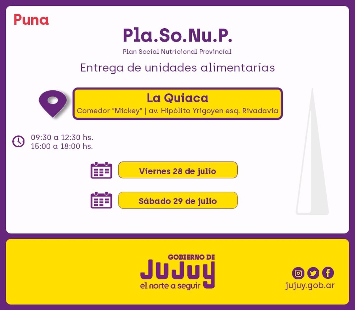 - En La Quiaca, se realizará los días viernes 28 y sábado 29 de julio, en el Comedor “Mickey”, ubicado en avenida Hipólito Yrigoyen esquina Rivadavia, en los horarios de 09:30 a 12:30 y 15:00 a 18:00.
