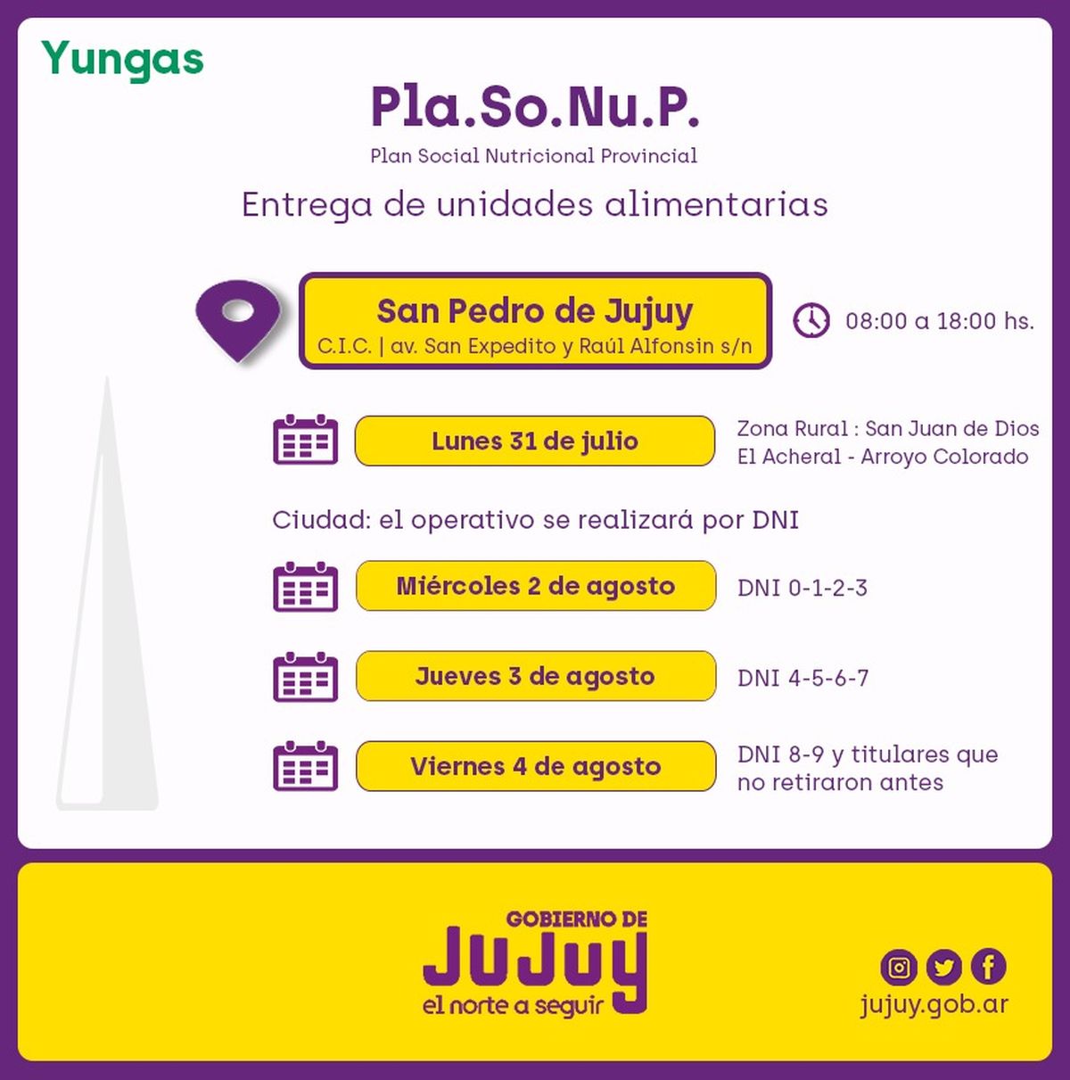 - En San Pedro de Jujuy, se efectuará los días desde el lunes 31 de julio al viernes 4 de agosto, de la siguiente forma: