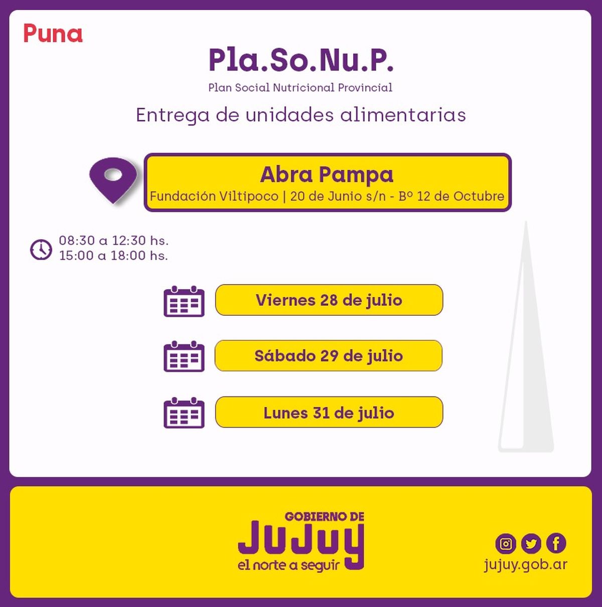 - En Abra Pampa, se efectuará los días viernes 28, sábado 29 y lunes 31 de julio, en la Fundación Viltipoco, ubicada en Calle 20 de Junio s/n, barrio 12 de Octubre de 8:30 a 12:30 y de 15:00 a 18:00 horas.