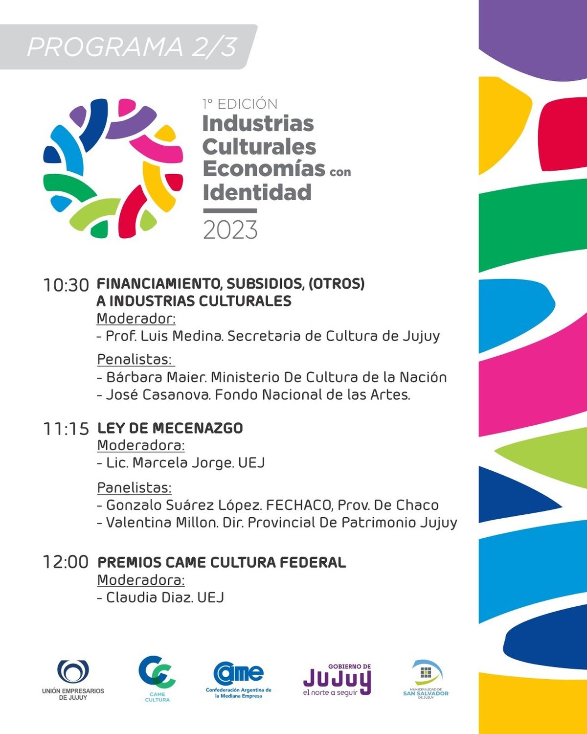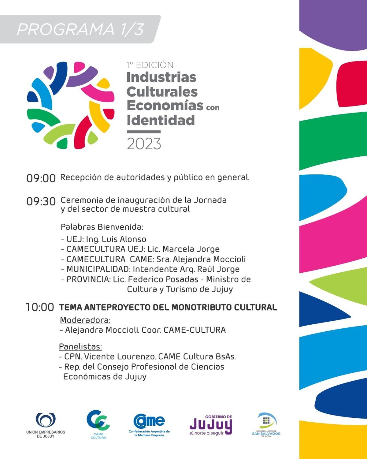 La presentación del encuentro "Industrias Culturales, Economías con Identidad", que tendrá lugar el día 14 del presente mes a partir de 9 horas, en el centro cultural "Éxodo Jujeño" de San Salvador de Jujuy fue encabezado por el presidente de la Unión empresarios de Jujuy, Luis Alonso acompañado por su vice presidenta Marcela Jorge, quien es representante de Jujuy en la CAME y Maximiliano Chedrese en representación de la Secretaría de Cultura.