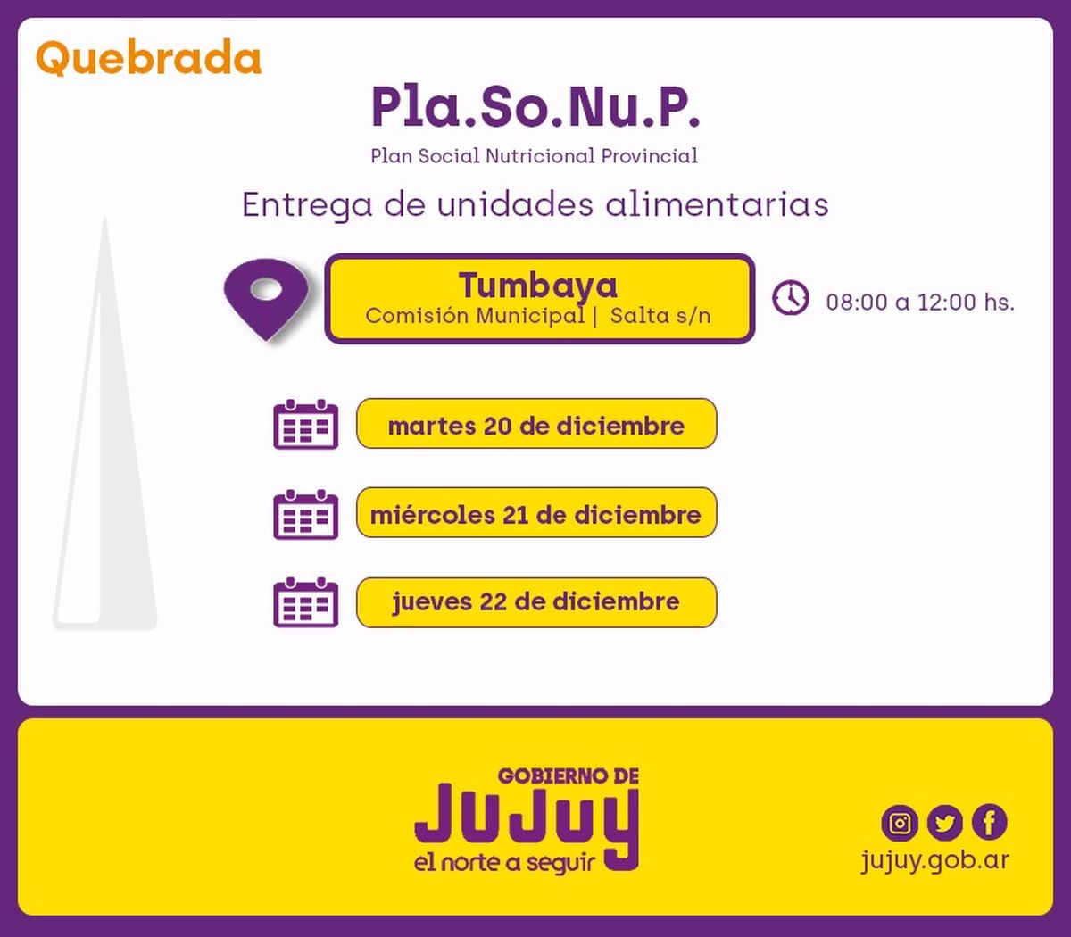 -En Tumbaya, tendrá lugar los días martes 20,miércoles 21 y jueves 22 de diciembre, en la Comisión Municipal, ubicada en Salta s/n, en el horario de 08:00 a 12:00.