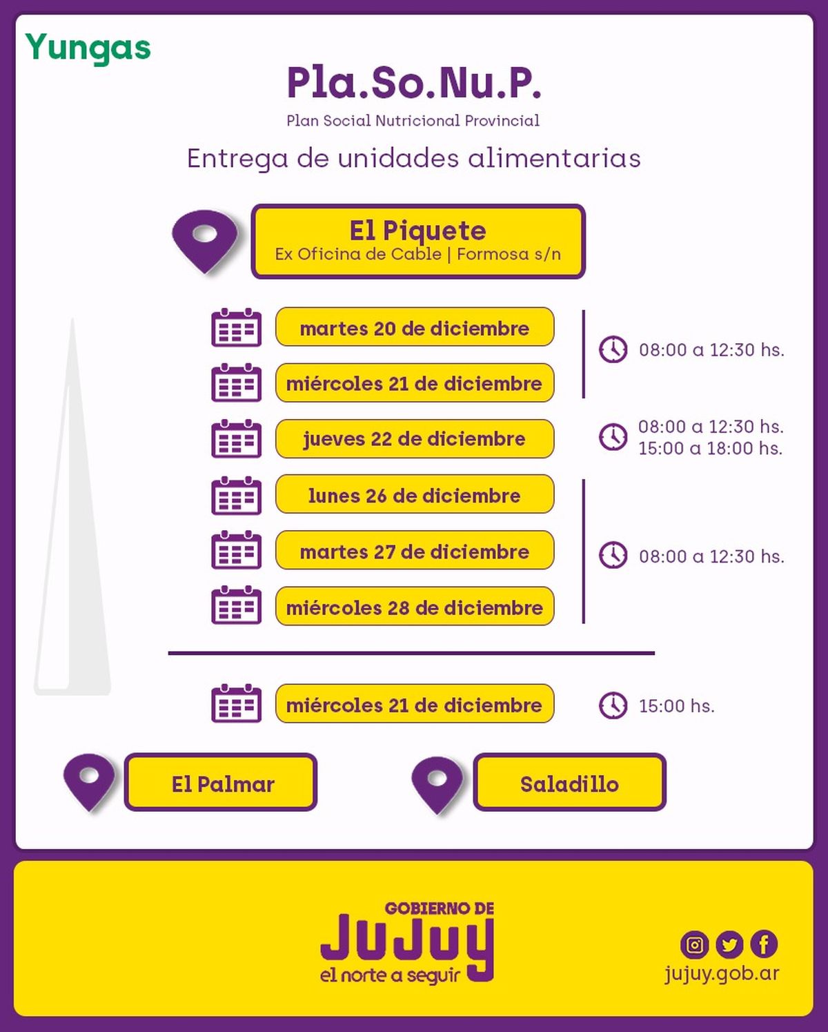 -En El Piquete, se concretará los días martes 20, miércoles 21, jueves 22, lunes 26, martes 27 y miércoles 28 de diciembre, en la Ex Oficina de Cable, ubicada en Formosa s/n, de la siguiente forma: